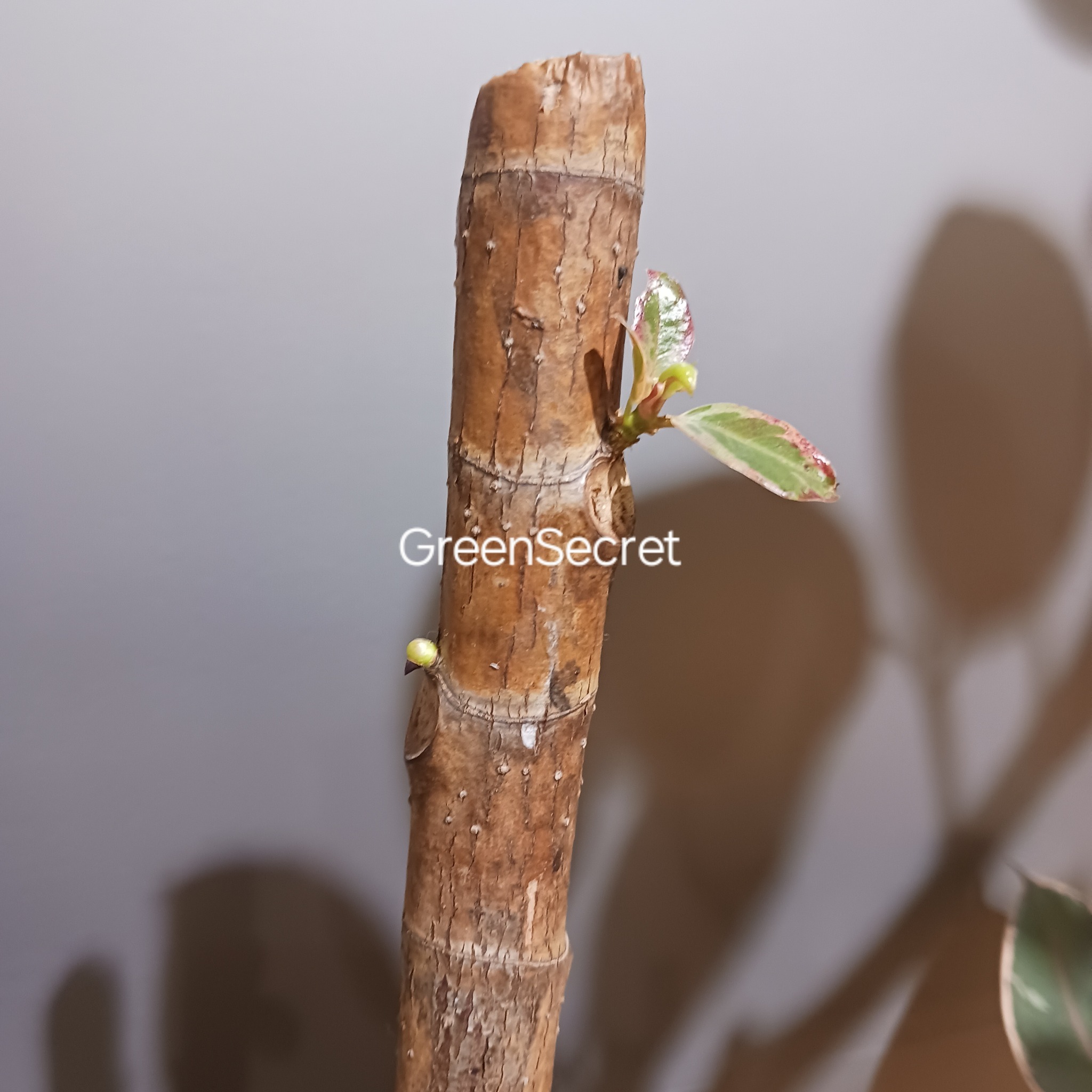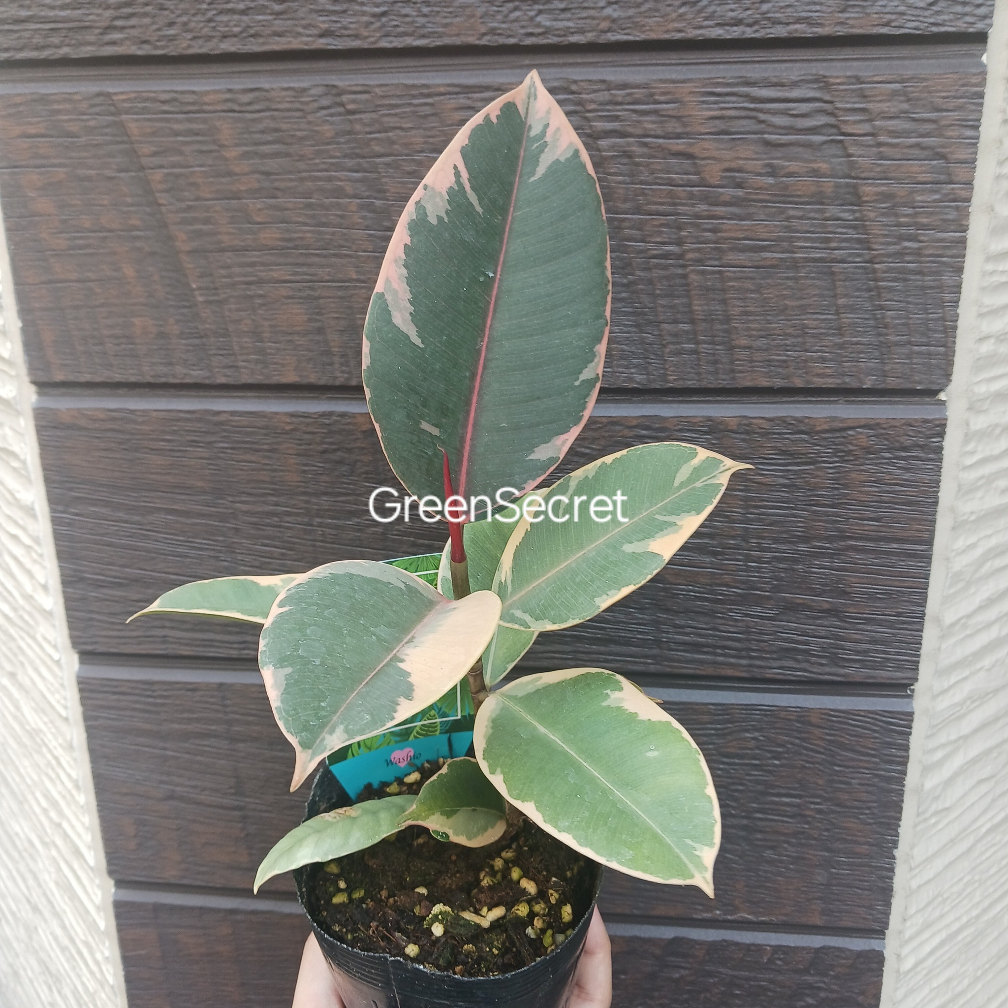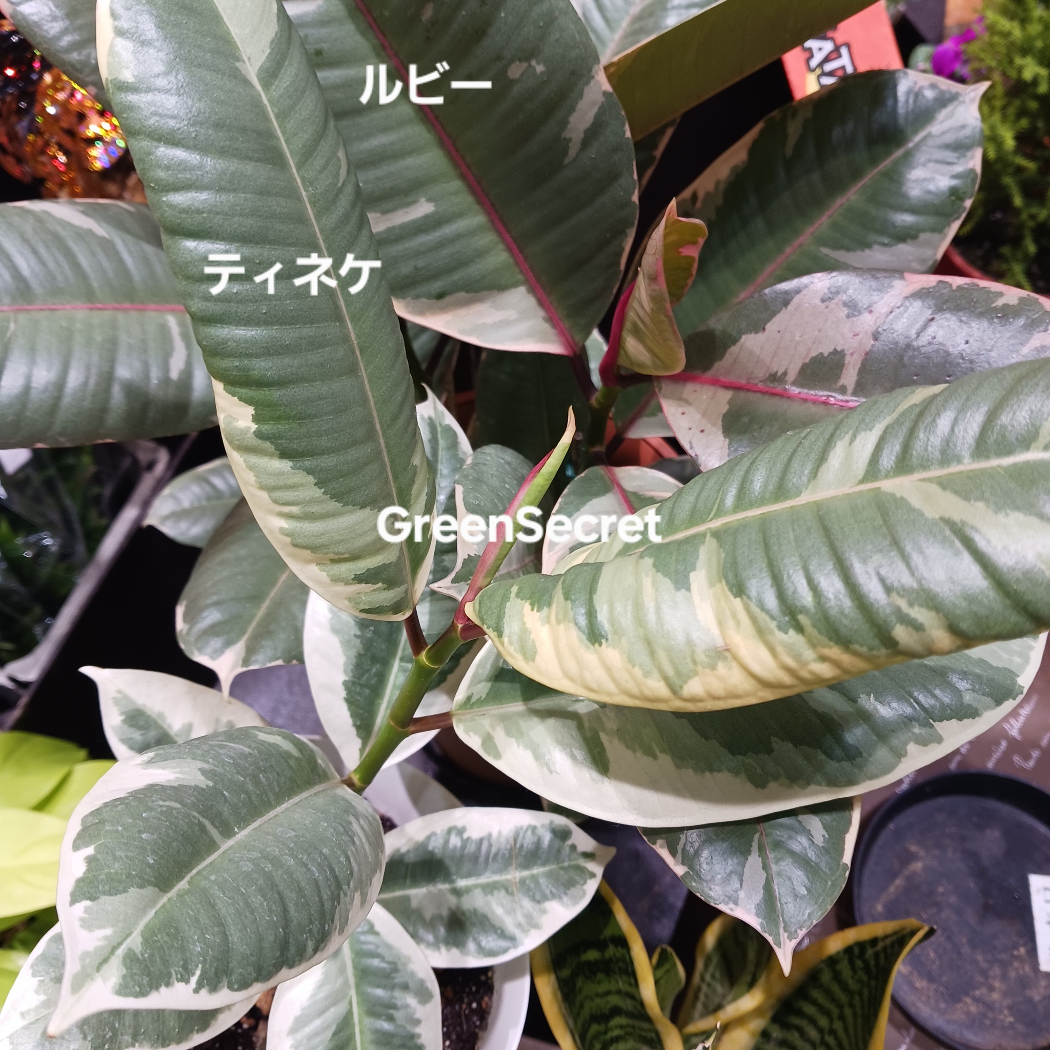 ティネケ(Ficus elastica ‘Tineke’)は、フィカス・エラスティカ(インドゴムノキ)の別の斑入り品種で、白〜黄緑系の斑が入る爽やかな葉が特徴。新芽はピンク色を帯びるためルビーのようですが、ルビーと比べたら白斑が多いです。