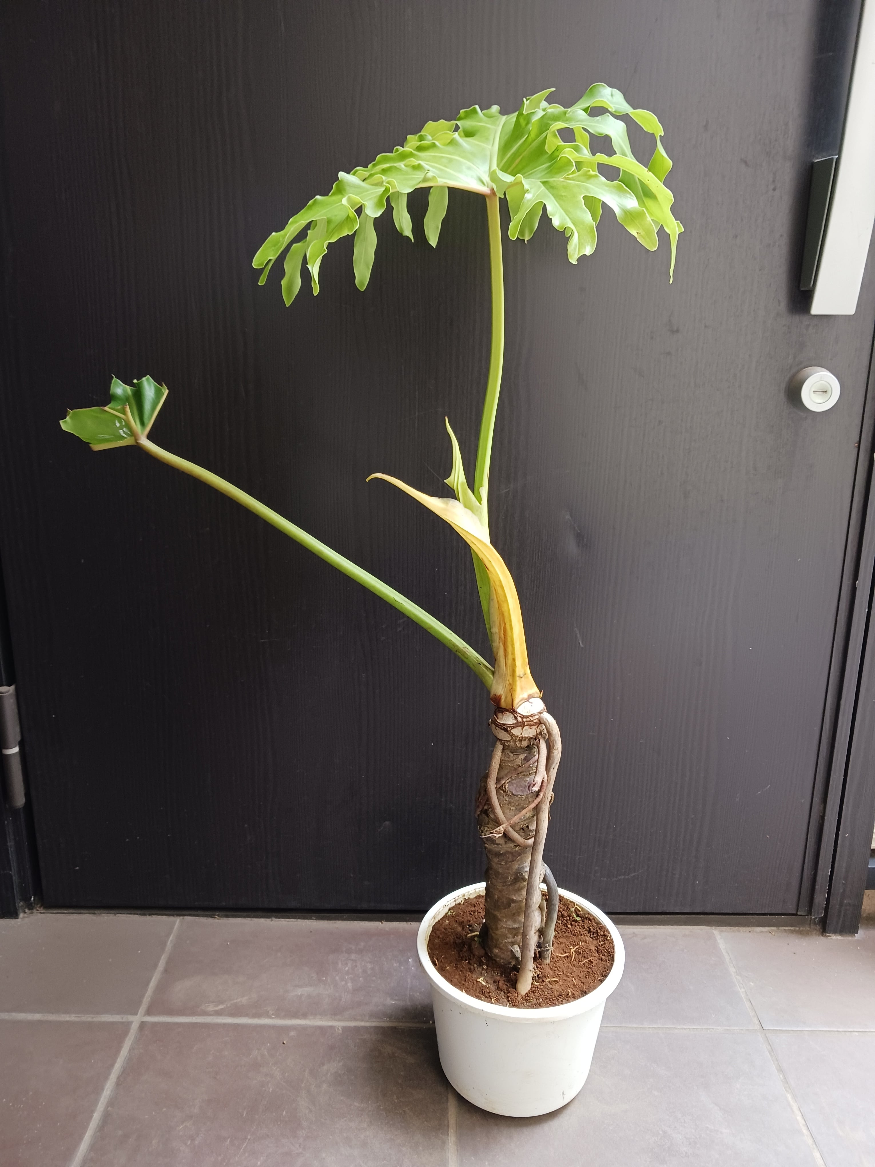 太さのある幹と気根が魅力です。より良い葉を出させるために葉を半分に切っています。(光合成のために残してます)新しい葉が出てきたら根本から切って構いません。