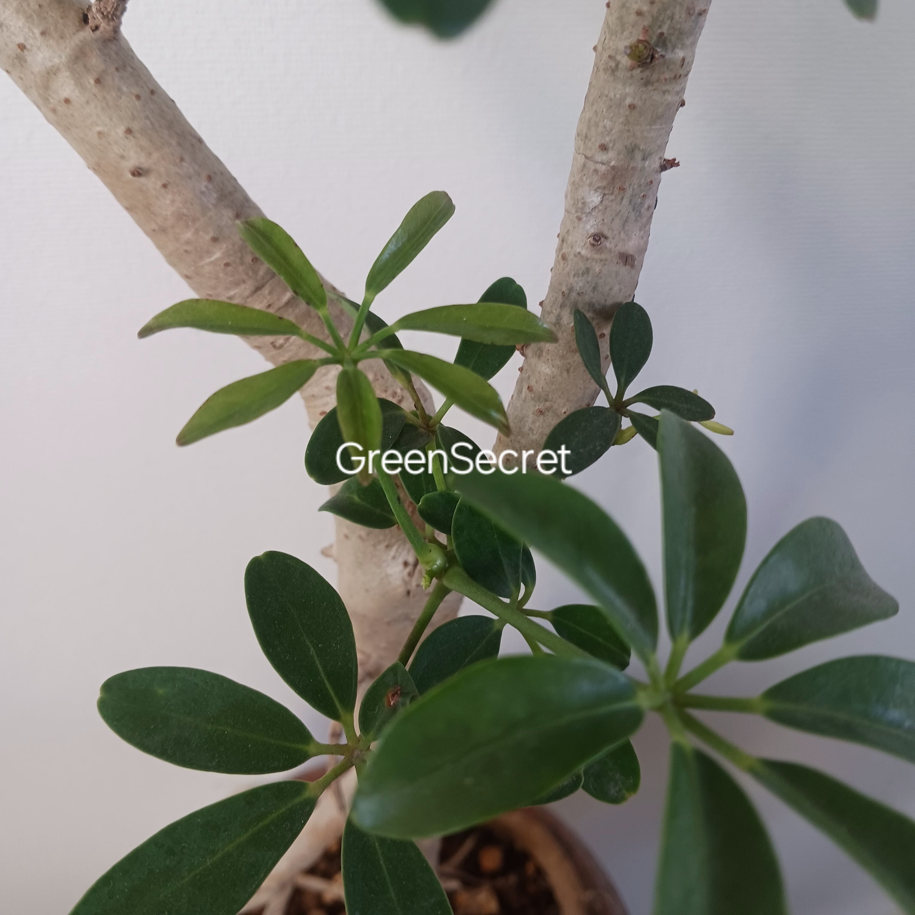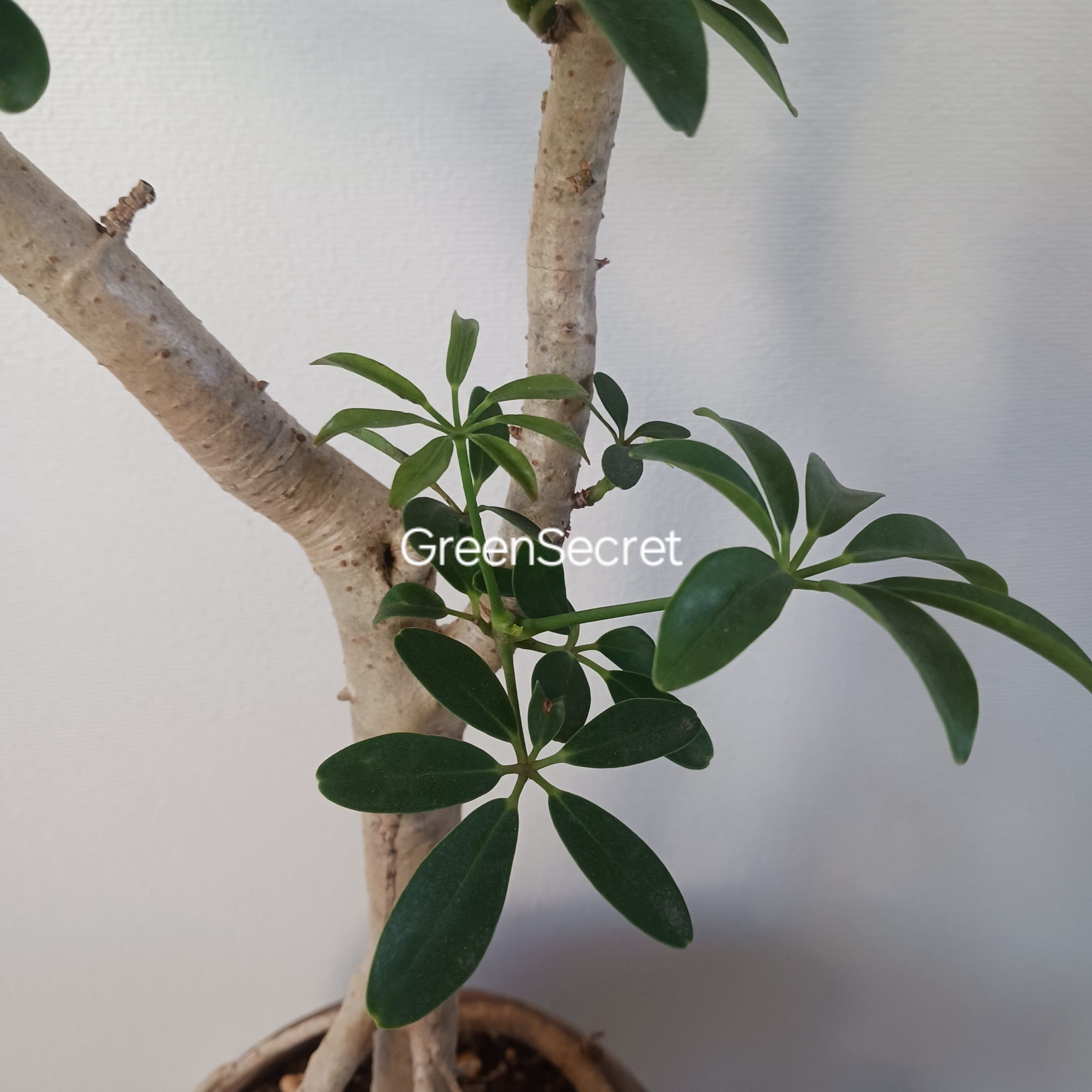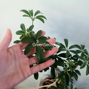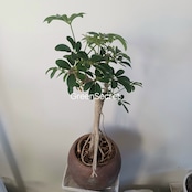 手のひらを広げたようなシェフレラ(ホンコンカポック)の葉をぎゅっと小さくしたコンパクタです。シェフレラコンパクタやホンコンコンパクタがあり、こちらはクイーンといわれ、丸みのある葉っぱが特徴です