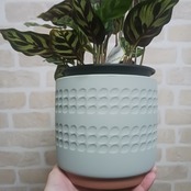 葉の模様が特徴的なカラテアの中でも人気のマコヤナと鉢カバーのセットです。