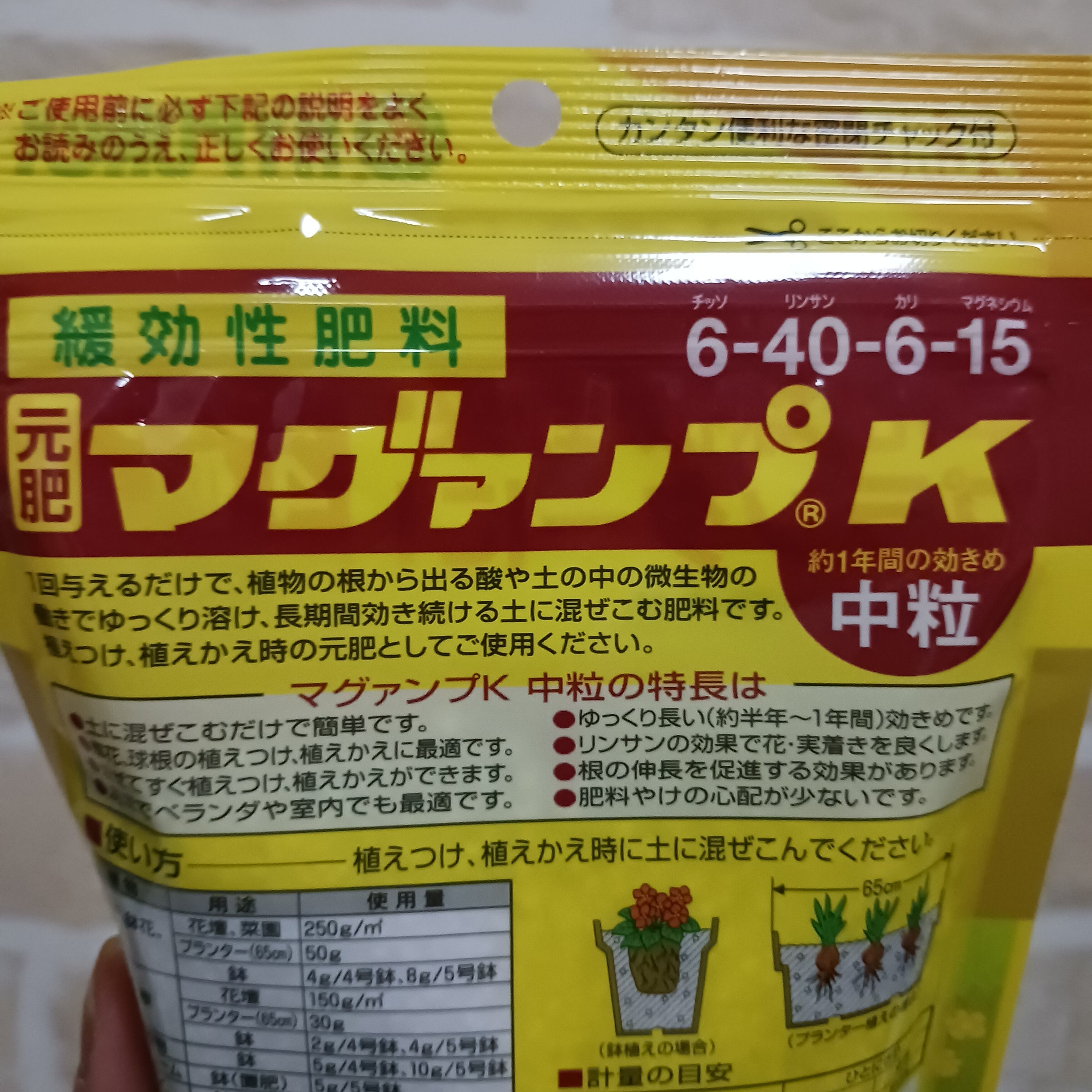 すでに植わっている植物にも、土にばらまくだけの追肥マグァンプK小粒があります!